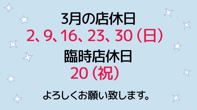 4月の店休日:4/6(日)、4/13(日)、4/20(日)、4/27(日)