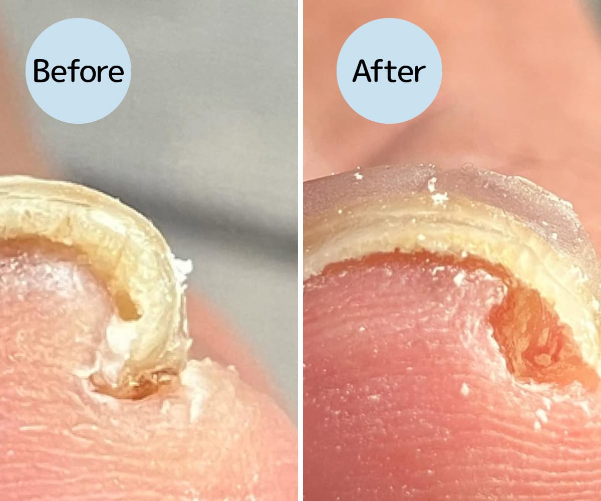 丁寧に爪のお掃除を行い、巻き爪による圧迫を和らげるケアをいたしました。
